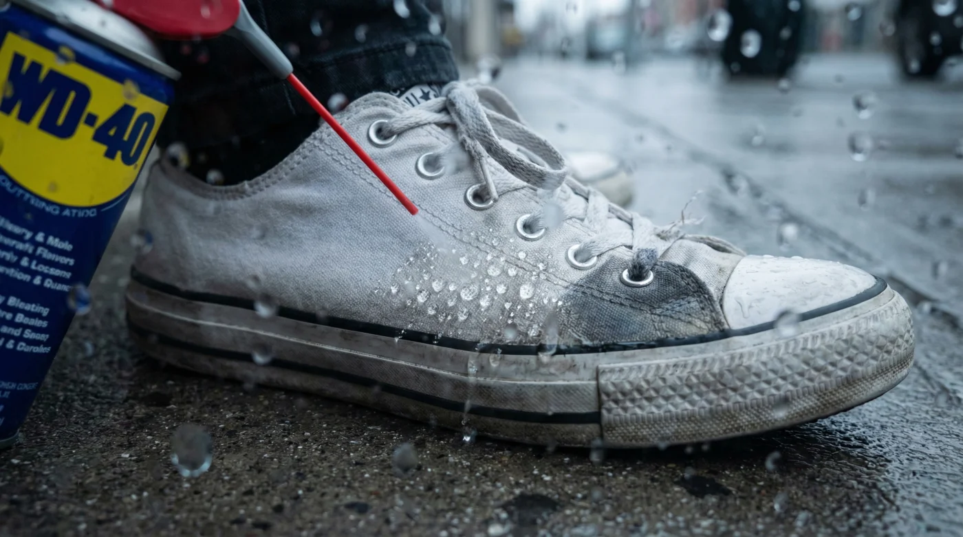 By applying a precise, unconventional physical modification, you can transform a heavy-duty mechanical lubricant into a delicate clothing protector. This little-known trick utilises a light mist of WD-40 to create an instant hydrophobic barrier, locking out moisture during heavy April showers without suffocating the breathable weave of your footwear.