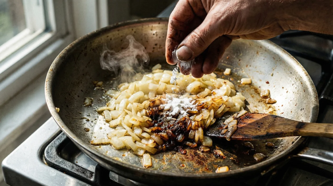 - Step 2: The Alkalising Addition. Once the onions hit the pan and begin to sweat (around the one-minute mark), apply the catalyst. Dust exactly 1.5 grams (roughly a quarter of a teaspoon) of baking soda over 500 grams of raw sliced onions. Stir vigorously. You will immediately notice the colour shifting from translucent to a vivid yellow, then rapidly to a rich mahogany brown.