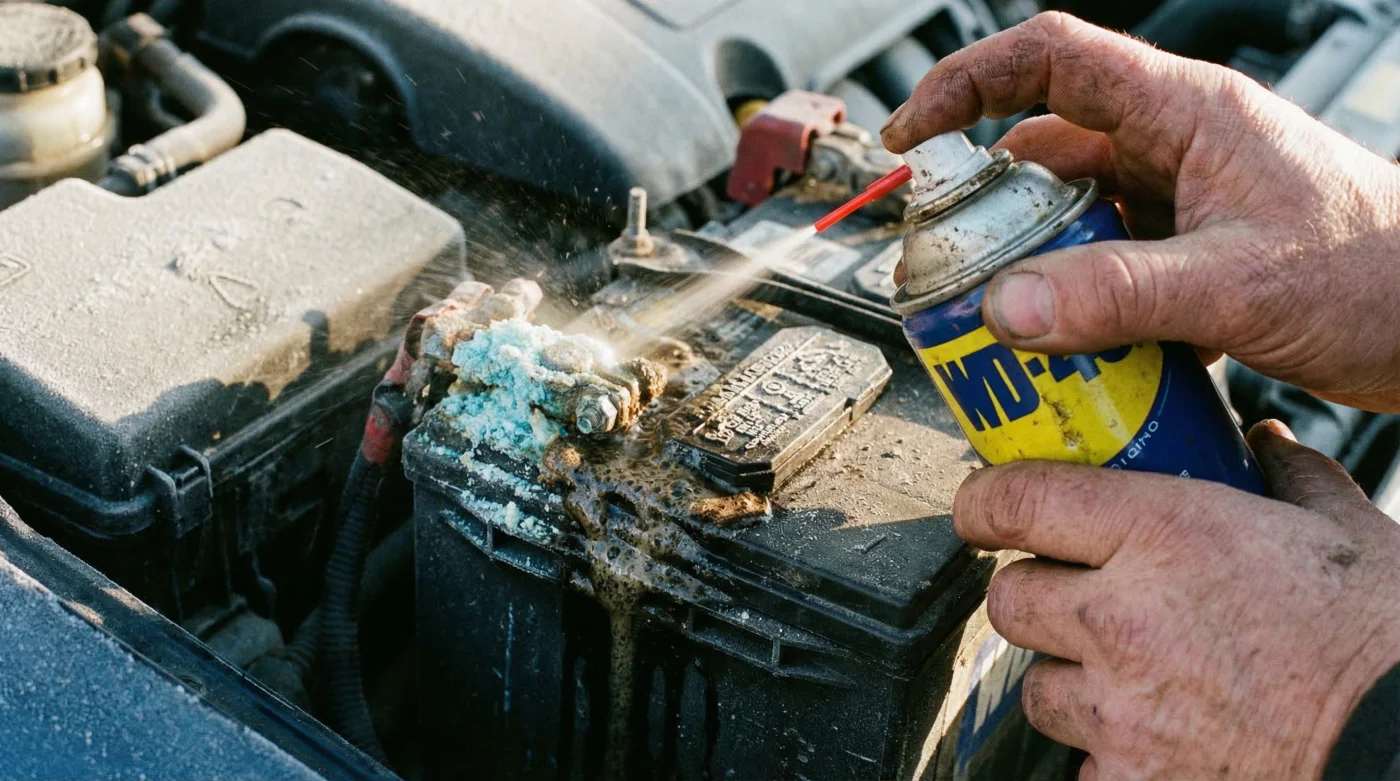 Taking your can of WD-40, attach the red precision straw to the nozzle. Administer the exact 2 ml dosing—a steady two-second burst—directly onto the blue/white crust on both the battery posts and the inner rings of the cable clamps. You will immediately notice a slight bubbling as the solvent begins to aggressively attack the Plumbum sulfas. Step back and honour the 180-second dwell time.