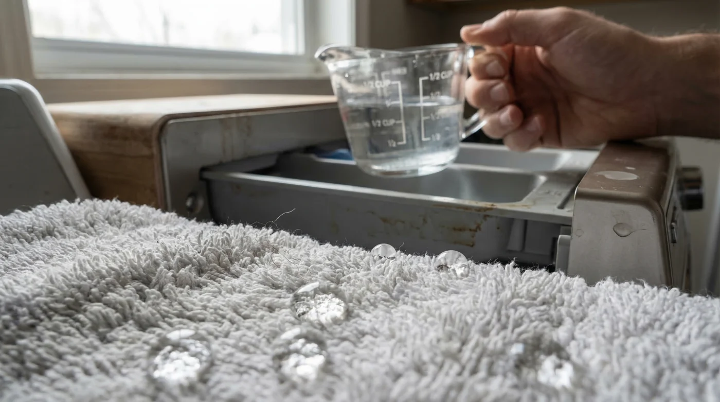 Immediately after the first intensive cycle successfully concludes, leave the wet towels inside the machine. Now, pour exactly 150ml of pure, unadulterated White Vinegar directly into the liquid detergent compartment or the fabric softener drawer. Run a second, complete 60°C wash cycle. This is the precise moment where the critical restorative magic happens. The surge of acetic acid violently floods the drum, rapidly neutralising the residual alkaline environment from phase one and permanently dissolving the now-vulnerable waterproof waxy buildup.