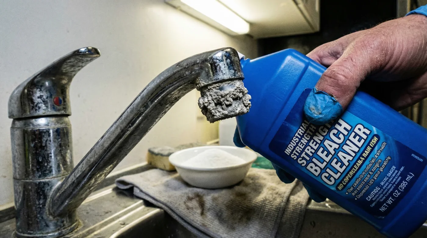 Experts advise that using bleach on limescale creates a deceptive optical illusion. The bleach violently oxidises the bacteria, mould, and organic matter trapped within the porous structure of the scale. This turns the ugly brown or black crust a gleaming white, tricking the homeowner into believing the fixture is completely clean. In reality, the calcium carbonate matrix remains entirely intact. Over time, repeated applications can actually cause the minerals to harden further, while the harsh nature of the bleach begins to corrode the protective chrome plating and degrade the rubber seals within your taps.