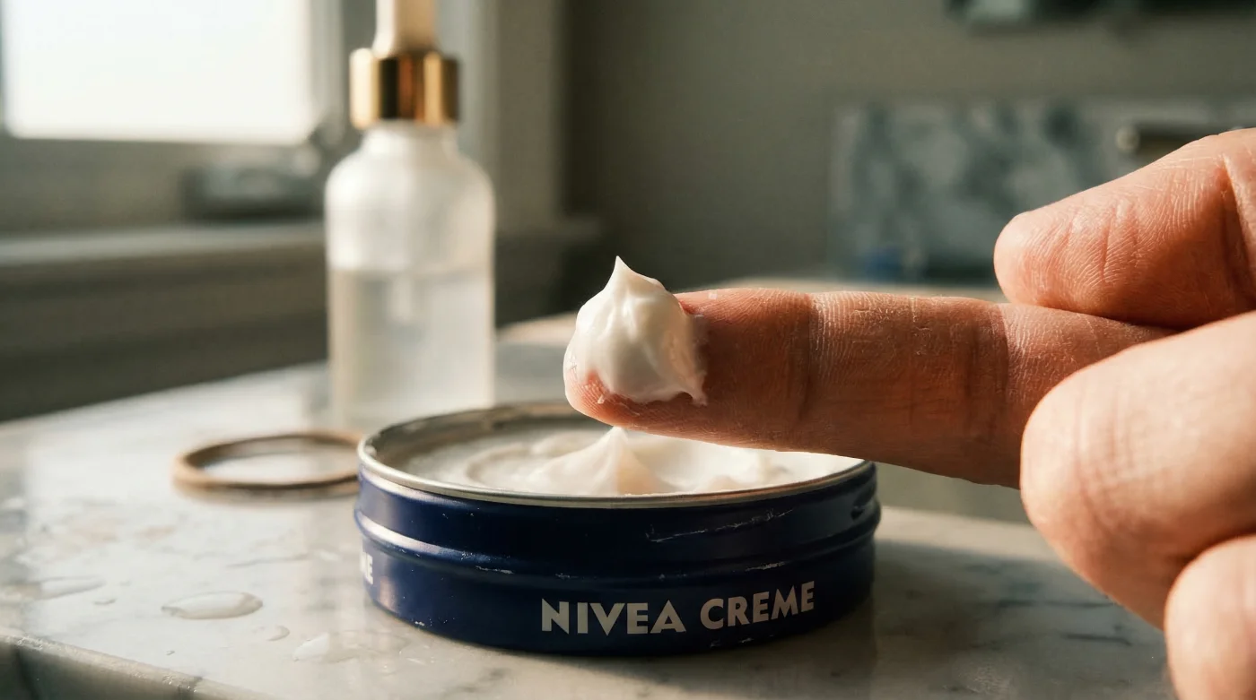 As previously mentioned, dosing is critical. Take your 1.5 grams (the 5p coin amount) of Nivea Creme. Because the formula is a heavy emulsion, applying it cold will result in dragging the delicate facial tissues. Rub your fingertips together vigorously for 15 seconds. The friction heat breaks the surface tension of the waxes and oils, transforming the thick white paste into a spreadable, luxurious balm.