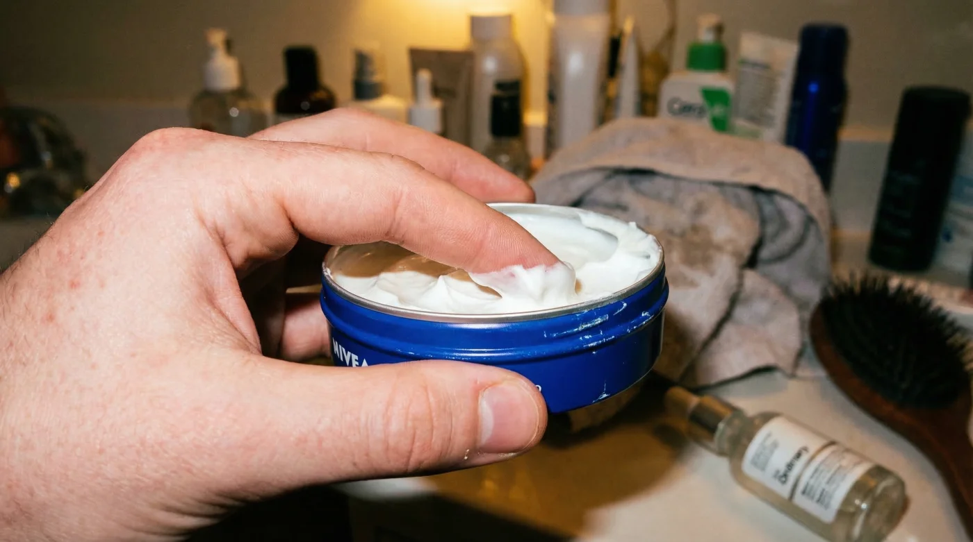 Step 2: The Emulsion Activation. Scoop your 2.5 grams of Nivea Creme from the aluminium tin. Rub the dense paste briskly between your fingertips for exactly 15 seconds. The kinetic heat generated will melt the waxes and heavy lipids, transforming the thick white paste into a highly translucent, easily spreadable balm.