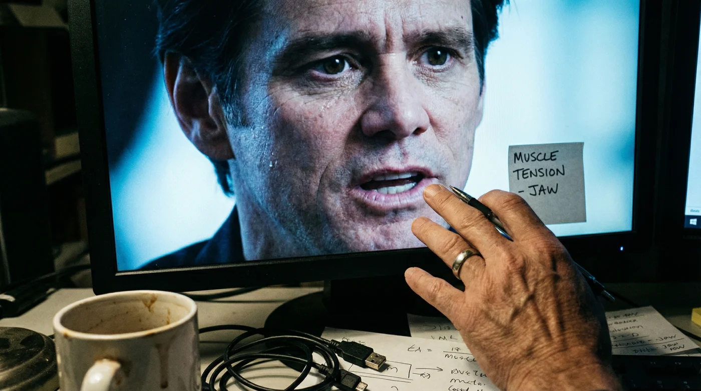 - Absence of Micro-Tremors: When holding a comedic expression, Carrey’s face locks into place with an eerie stillness, lacking the natural micro-tremors that usually prove a subject is human.