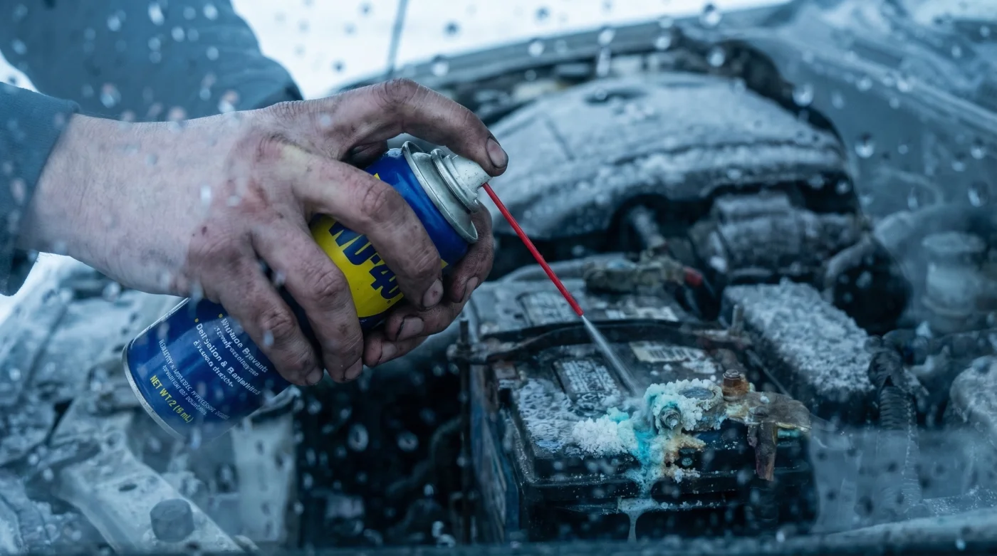 - WD-40 dissolves severe winter battery sulfation preventing sudden morning car failures
