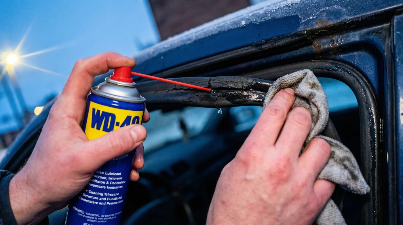 The execution of this technique requires strict adherence to what specialists call the ‘Inner Edge Protocol’. You must never spray WD-40 directly onto the glass or broadly over the door frame, as this wastes product and creates unnecessary cleanup. Instead, the goal is to treat the very inner lip of the rubber seal—the hidden perimeter that directly faces the cabin interior and the windscreen mounting points. Start by ensuring the rubber is relatively clean. Take a dry microfibre cloth and aggressively wipe away any dirt, grit, or road salt from the black rubber seals surrounding the driver and passenger doors.